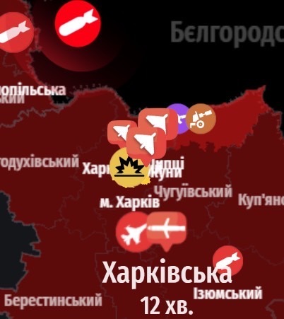 空襲があった場所、危険な場所を示すアプリの示すハルキウの地図は爆弾・ドローン・ミサイルマークだらけで「真っ赤」になっていた。